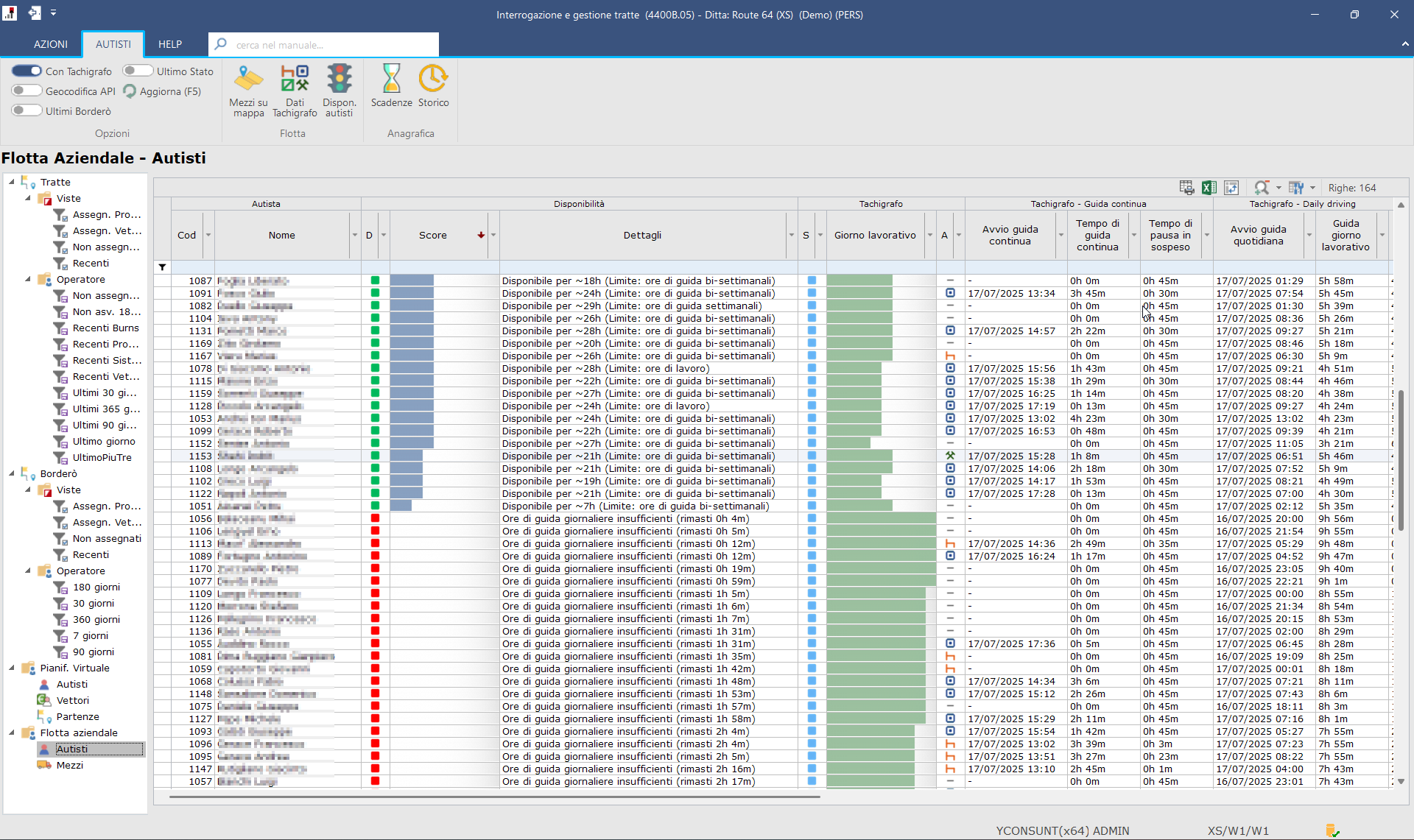 Sfruttando i dati del tachigrafo, ESOLVER Trasporti analizza automaticamente la disponibilità di ogni autista per un nuovo viaggio. Il sistema applica criteri decisionali avanzati per escludere a priori i conducenti non idonei, ad esempio a causa di un riposo settimanale imminente o di ore di guida giornaliere o bi-settimanali insufficienti. Gli autisti idonei vengono poi ordinati tramite un punteggio qualitativo, calcolato in base alle ore di guida e di lavoro residue, proponendo sempre la risorsa con il più ampio margine operativo.